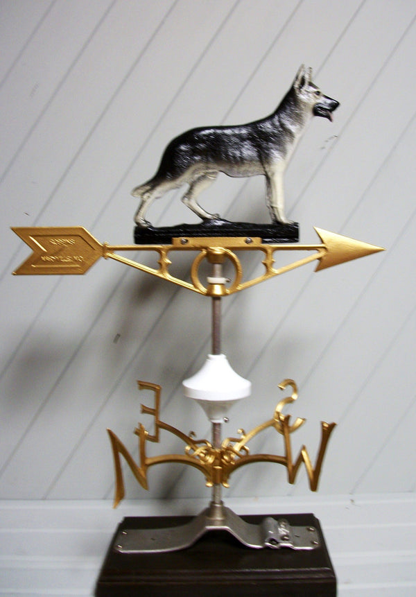 The German Sheperd Dog Weathervane by Robbins is made of beautifully painted cast aluminum which never rusts. The instructions included with each weather vane provide easy and fast installation. Will look beautiful on your barn, shop, home, stable, fence or posts. Ornamental globes/balls sold separate! Complete weathervane kit.