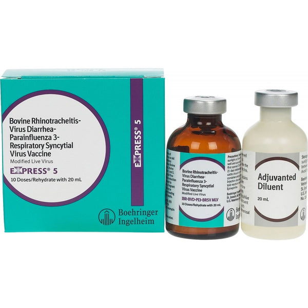 Express 5 cattle vaccine from Boehringer Ingelheim protects against IBR, BVD Types I & II, PI3 & BRSV. Do not use in pregnant cows or calves nursing pregnant cows. Calves vaccinated before 6 months of age should be revaccinated at 6 months. Give 2 ml SQ. Repeat in 14-28 days. Revaccinate annually. 21 day slaughter withdrawal.