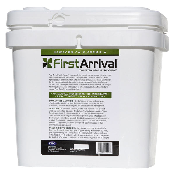 Feed supplement for newborn calves helps bolster the calf's developing immune system during its first 14 days of life. Easily digestible combination of targeted egg-yolk proteins, lactic-acid forming bacteria and unique carbon extract (EncryptTM) aids in combating 11 common pathogens that cause scours and malnutrition in the neonatal calf. In a recent study, herds feeding First Arrival as recommended decreased antibiotic therapy in calves by 60%. Black coloration of product turns manure dark gray, confirming calves are receiving treatment provided. Highly soluble and quick mixing. Each gm contains 15 million CFUs total lactic-acid bacteria. Contains no blood serum. Dosage: First 2 days, 10 gms/feeding twice daily. Mix with milk replacer, whole milk or colostrum. Days 3-14, 5 gms/feeding twice daily. 5 gm scoop included.