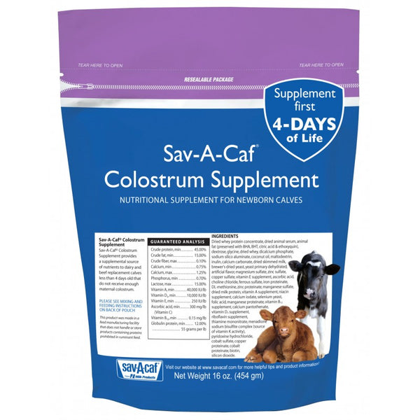Sav-A-Caf Colostrum Supplement contains a unique combination of pure Bovine colostrum and serum, and highly digestible fats, and features our exclusive blend of functional proteins, probiotic complex sugars, vitamins and minerals that supports immune development, digestive and overall health. Contains 15% fat, and 55 grams of essential Bovine globulin protein, with elevated levels of key antioxidant vitamins that newborn calves are often deficient in. Use 1 pouch to supplement lower quality colostrum, or 2-3 pouches when replacing maternal colostrum entirely. Feed as soon as possible after birth for best absorption (within 2-3 hours if possible).