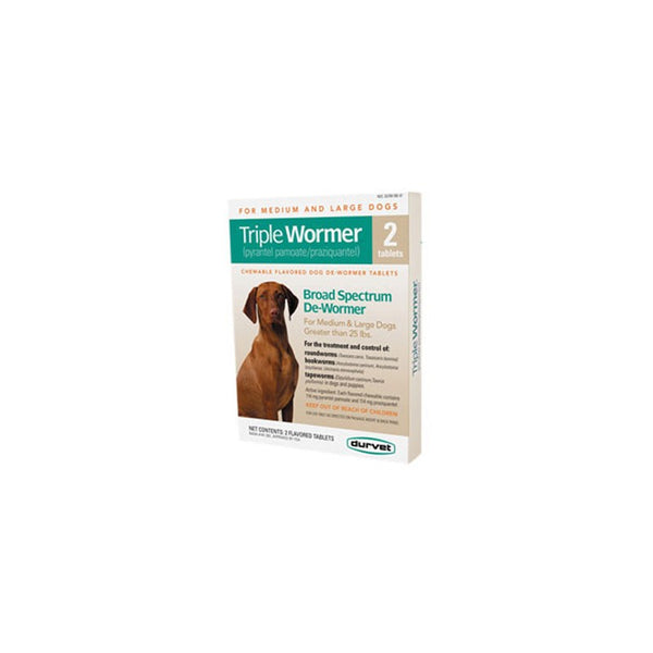 Triple Wormer® is for the treatment and control of roundworms (Toxocara canis, Toxascaris leonina), hookworms (Ancylostoma caninum, Ancylostoma braziliense, Uncinaria stenocephala) and tapeworms (Dipylidium caninum, Taenia pisiformis) in dogs and puppies. For small dogs and puppies only (6.0 to 25 pounds). Pyrantel Pamoate (30 mg) and Praziquantel (30 mg. 2ct)