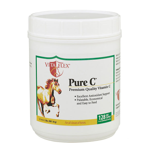 Concentrated Value Although in horses vitamin C is produced in the liver, optimum health during periods of stress, intensive exercise, illness or injury may require more vitamin C than the body can produce. Vitamin C, sometimes called the “workhorse of the vitamins”, is required in hundreds of metabolic processes. Vita Flex Pure C™ contains only premium grade, very palatable pure ascorbic acid, for maximum flexibility and value. Pure C is the most economical, most effective way to enhance horses' diets with the benefits of vitamin C. The Structural Vitamin The horse's body needs vitamin C to grow, maintain, and repair structural tissues. Thefirst vitamin to be chemically isolated, vitamin C was originally noted for its ability to prevent scurvy, a disease marked by the breakdown of circulatory and connective tissue. More recent research has shown the need for vitamin C in producing specific proteins, such as collagen, and other structural elements of connective tissue. Because of this connection, many studies have focused on the impact of vitamin C on healing rates, bone modeling, blood vessel integrity, and tooth formation.