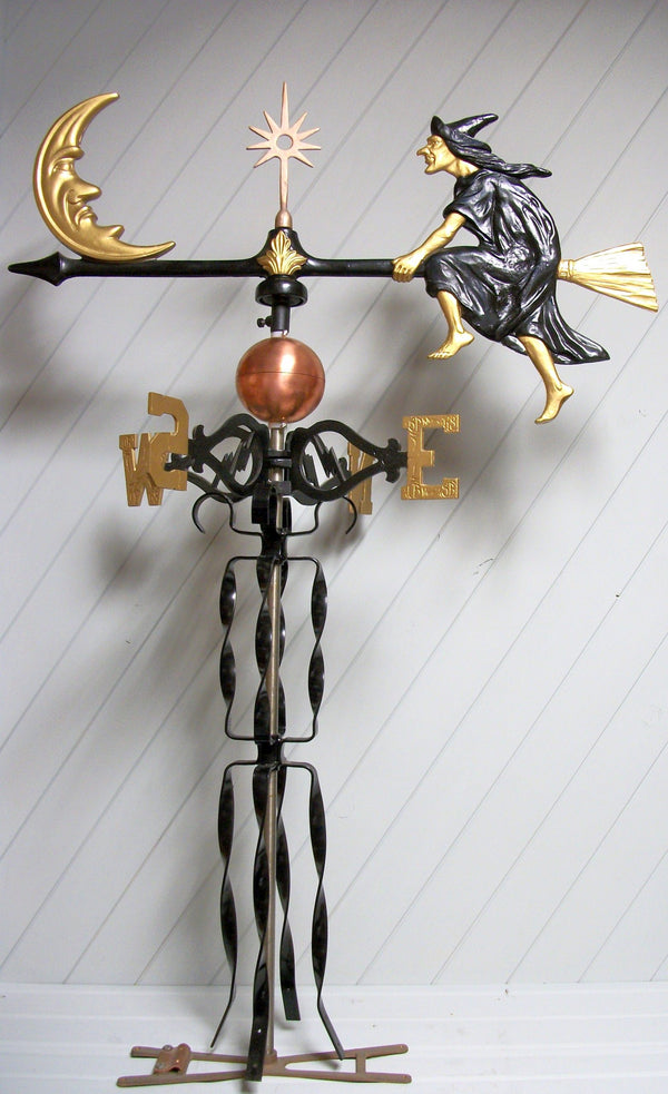 The Witch On Broom Weathervane by Robbins is made of beautifully painted cast aluminum which never rusts and includes copper ball. The instructions included with each weather vane provide easy and fast installation. Will look beautiful on your barn, shop, home, stable, fence or posts. This weathervane has a copper ball featured. Complete weathervane kit.